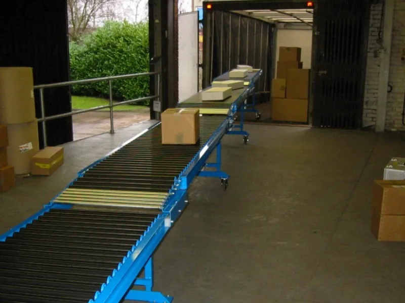 - Telescopic section extends inside the truck → cartons discharge onto a flexible roller conveyor → directed to sorting area.